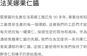 除了控制堅果的來源,法芙娜還要保證其卓越的風味和絕對穩定的品質。 正因為如此,法芙娜為其果仁醬系列選擇了世界上最優質的堅果, 其中包括: